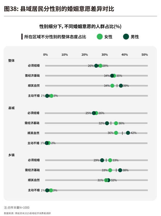乡镇的环境中,认为“必须结婚”的传统压力(男29.2%,女32.9%)都高于县城水平,乡镇男性展现出更深的经济焦虑,对“需要经济基础”的诉求(37.7%)最为强烈,高于女性。但乡镇女性“主动选择不结婚”的比例(2.9%)是男性(0.8%)的三倍有余。
