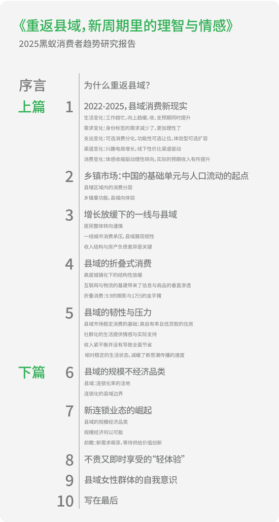 黑蚁关注商业机会与投资启示,县域市场的广阔与折叠是我们长期跟踪的趋势性机会,但我们更深层的兴趣在于人的变化与社会的变迁。县域不仅是消费市场,更是观察中国社会结构韧性、文化适应性与发展动能的关键现场。在这里,微观的选择、家庭的策略与市场的韧性,共同构成了理解中国经济与社会演进的一扇窗。