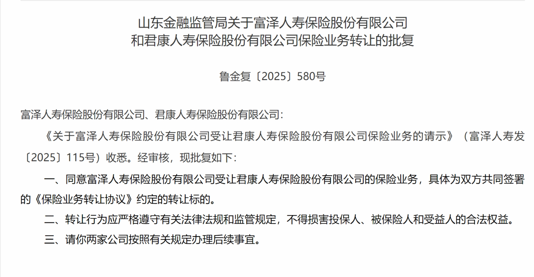和君康人寿保险股份有限公司保险业务转让的批复,同意富泽人寿保险股份有限公司受让君康人寿保险股份有限公司的保险业务,具体为双方共同签署的《保险业务转让协议》约定的转让标的。