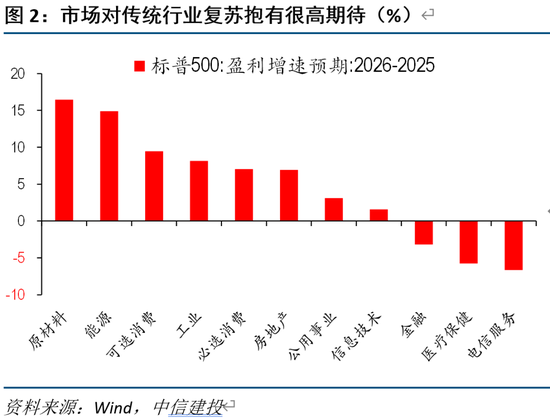 一方面,降息、减税等政策利好下,市场对2026年美国经济出现复苏的期待较高,即使近期就业数据一般,衰退担忧几乎未出现。一个典型例子是,美股分行业盈利预测来看,2026年传统周期行业(原材料、能源、工业、消费、地产等)均系统性改善。