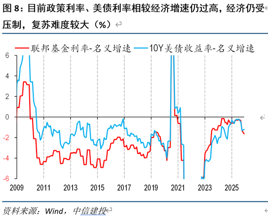 市场对美国经济的复苏,建立在政策改善的预期上,但实则目前联储降息力度仍不够(美债收益率较2024年并未实质性回落),财政刺激若局限在美丽大法案,也无法带来赤字率的大幅上行。服务通胀滞后回落、就业市场和薪资疲软,整体通胀也难以对联储构成掣肘。