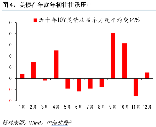 此外,从每年的股债季节性走势来看,年底年初由于圣诞新年假期,市场情绪往往较好,美股容易走强,而美债在12月、2月容易受到压制。